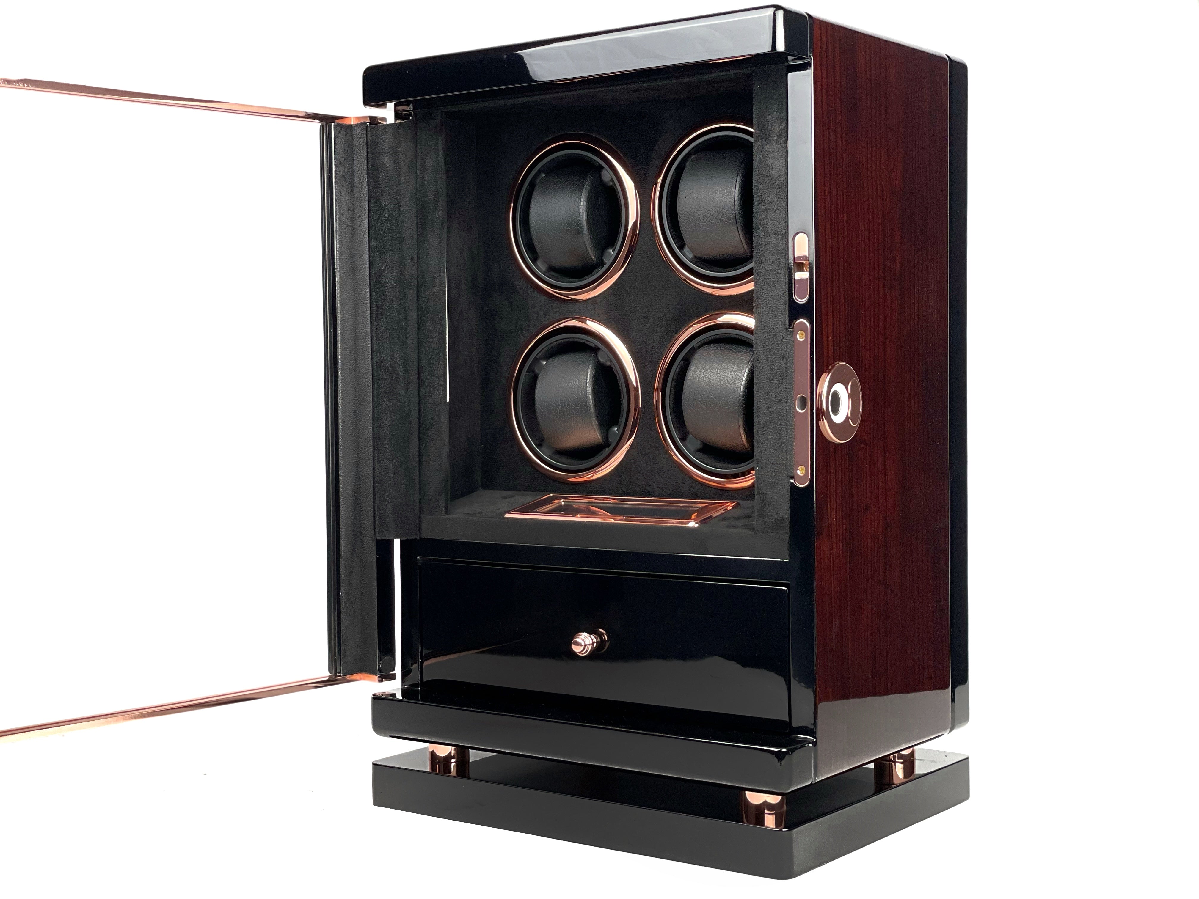 Crafted with a dark wood finish, this luxury watch winder combines biometric security with customizable winding settings for discerning collectors.