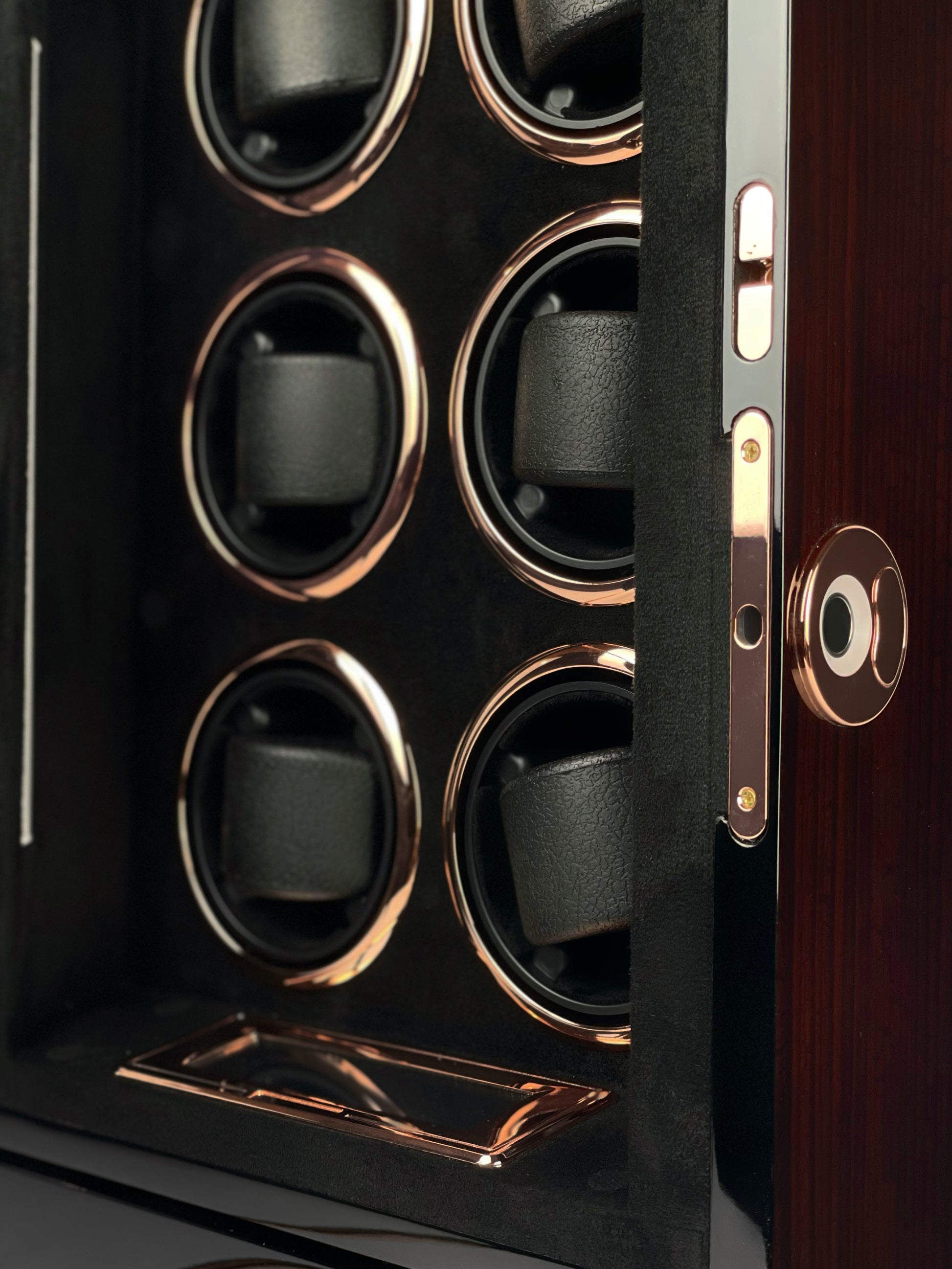 An all new watch winder featuring gold accents with unique finishing! This Granduer collection features a piano black finish paired with a walnut wood lining and rose gold plated trimmings. The interior is clad with black velvet to withstand the humidity of tropical countries.