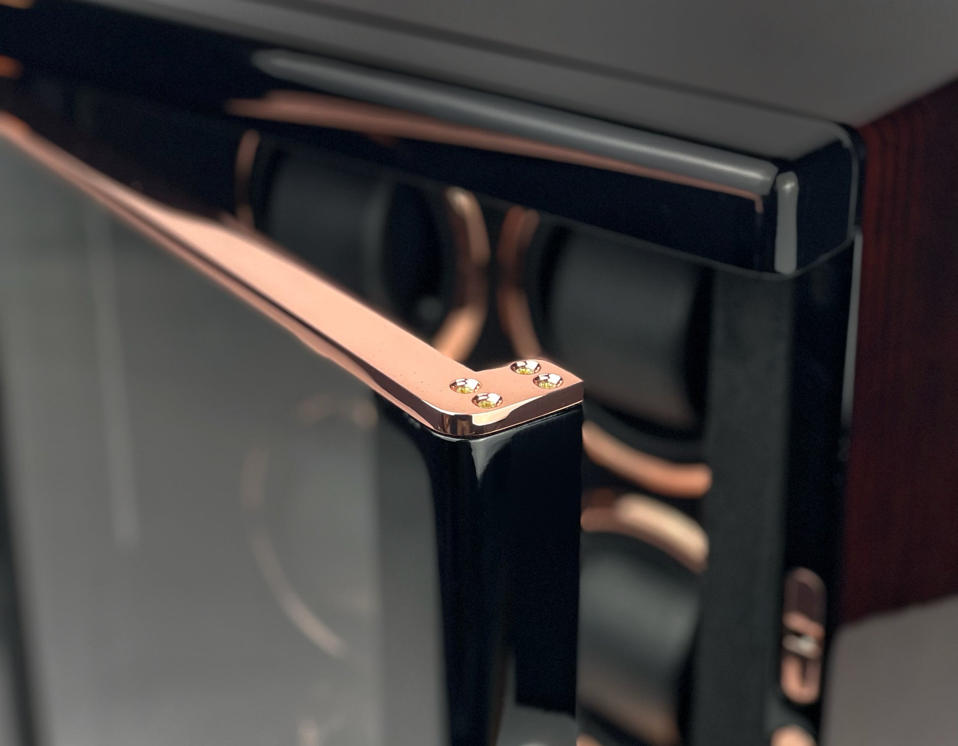 - Piano black finish paired with a walnut wood lining and rose gold plated trimmings